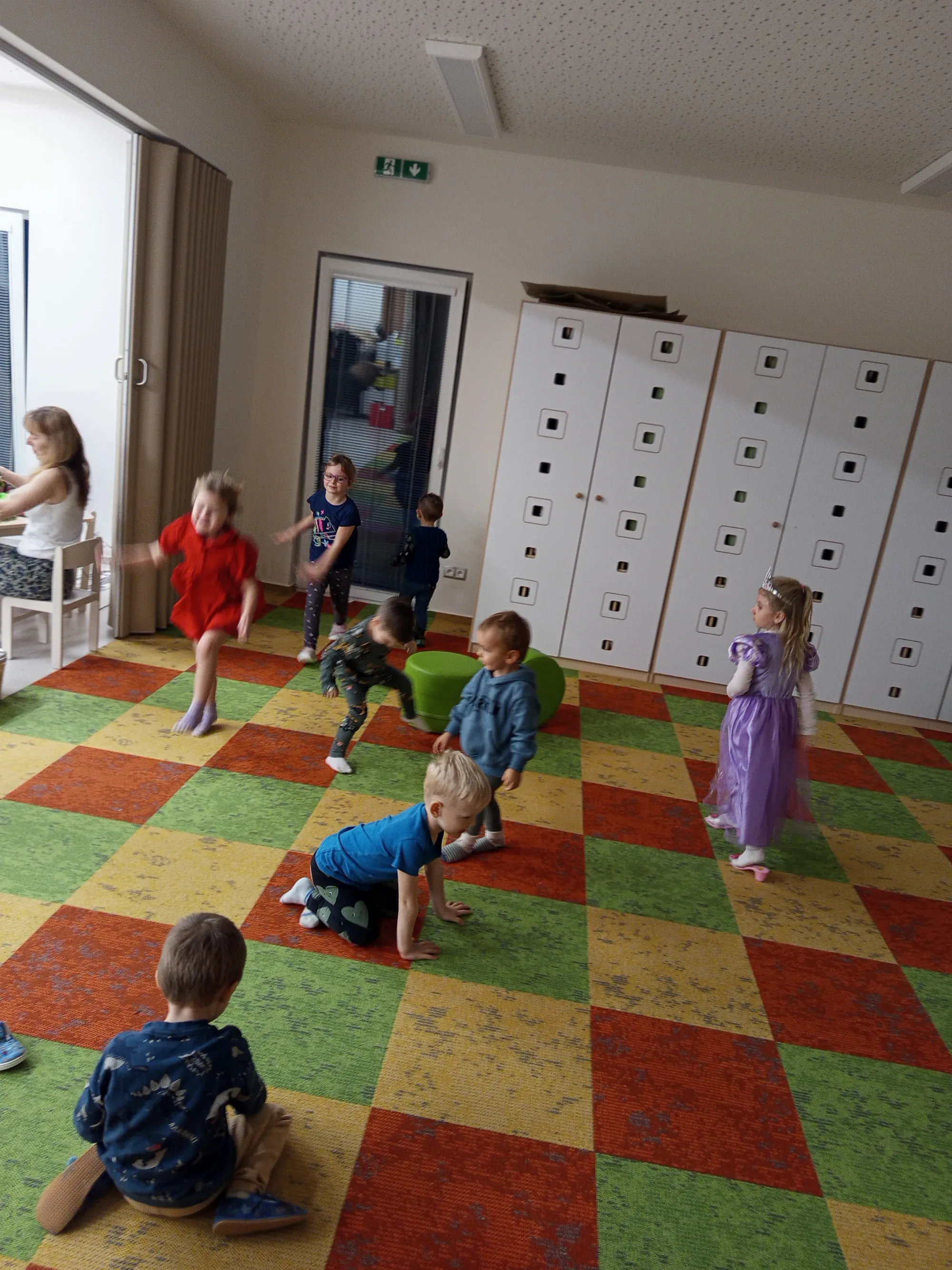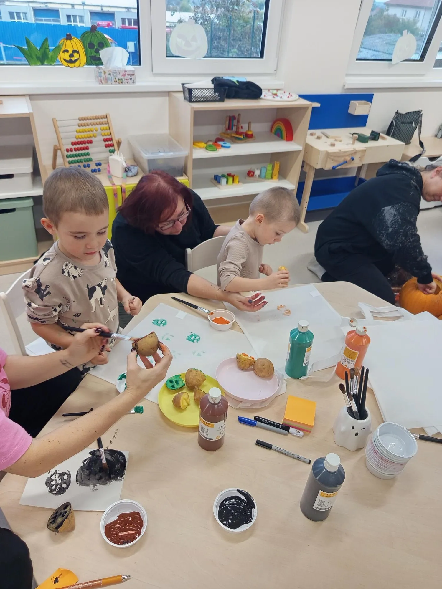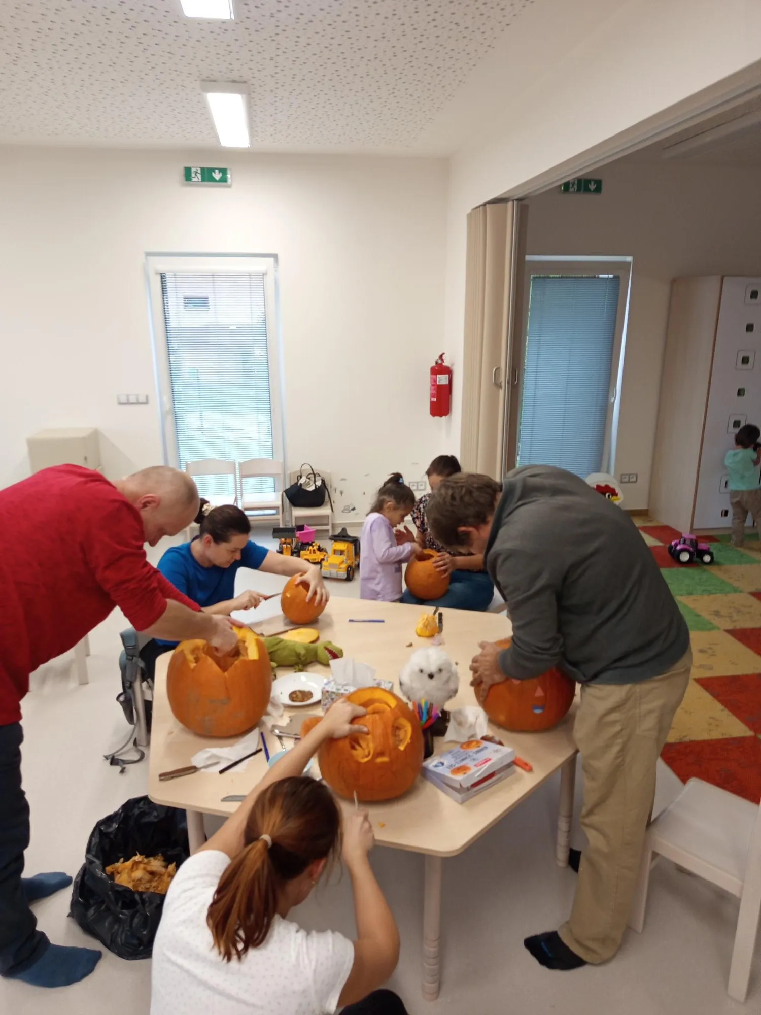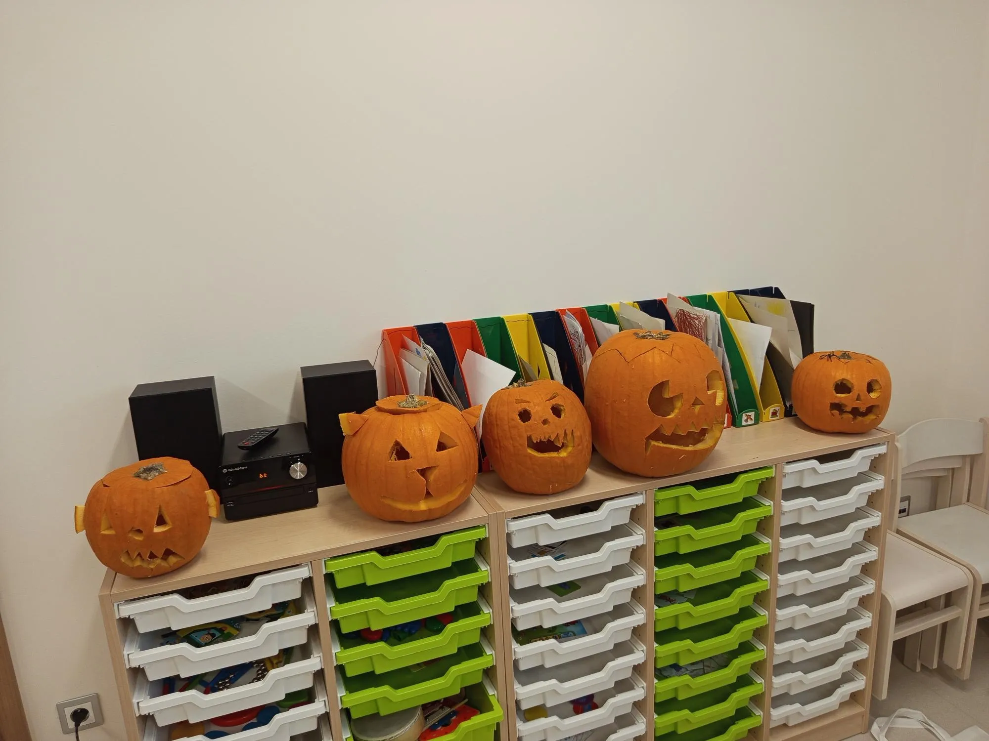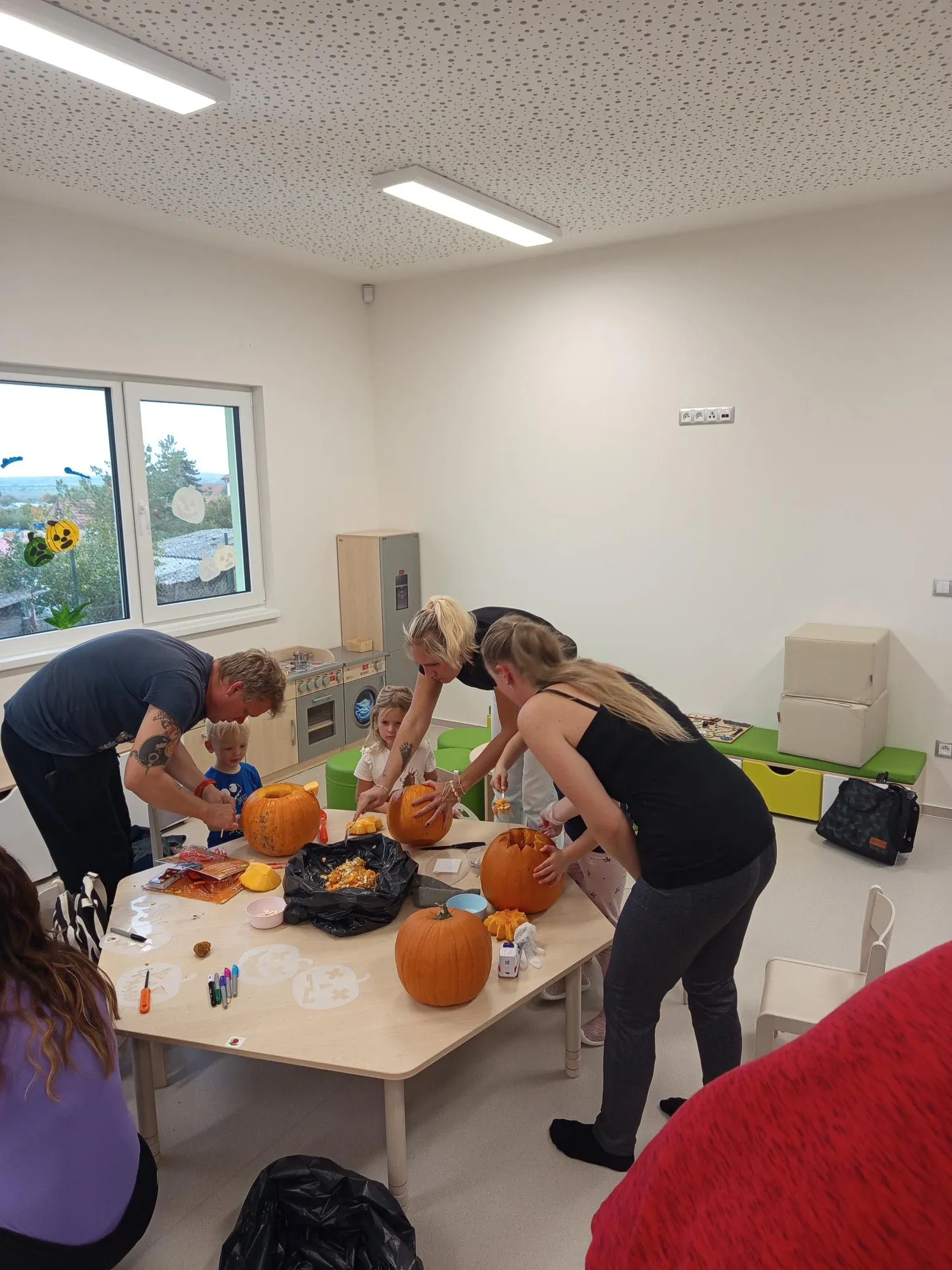 V říjnu naše školka pořádala podzimní akci s rodiči, na kterou jsme s dětmi strašidelně vyzdobily školku, připravily pohoštění pro rodiče, vydlabaly si dýně a pořádně si zatančily na diskotéce :-)